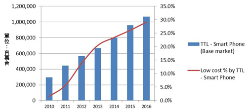 | 圖1 2010∼2016年全球低價智慧手機出貨量分析 |