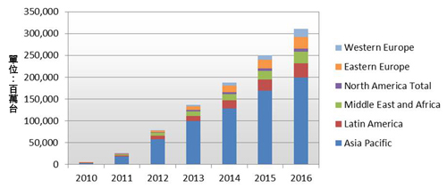 | 圖2 2010∼2016年全球Android平台低價智慧手機出貨量分析(以地域區分) |