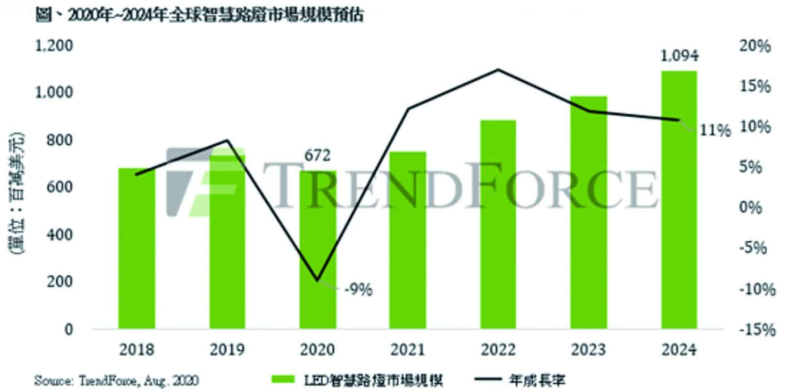 另據TrendForce旗下光電研究處統計,智慧路燈市場滲透率持續拉升,預估2024年全球LED智慧路燈市場規模(僅計LED頭燈與單燈控制系統)將達10.94億美元(圖1),2019至2024年複合成長率為8.2%;另據ABI Research預估,2018~2026年智慧路燈市場年平均複合成長率將達31%,到了2026年市場規模將成長9倍,達到17億美元。