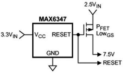 有一種型態的雙電壓系統,如輸出入為3.3伏特、核心為2.5伏特所使用的順序控制器採用監測3.3伏特的單電壓監控器元件,當電壓高於臨界值時,監控器會進行延遲動作,接著導通外部的P通道金屬氧化物半導體場效電晶體(MOSFET)(圖3),此作法可節省低電流應用的成本,但對於較大的電流,具備低閘源極電壓(Vgs)臨界值的低導通電阻(RDS(ON))P通道FET,其成本可能較高。
