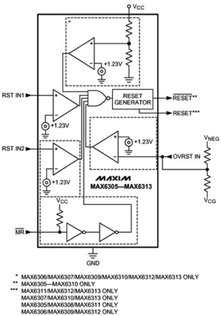 在多重電壓系統中,產生電源啟動重置(POR)訊號的最簡單方法就是監測3.3伏特或5伏特邏輯電源,在電源啟動時,當邏輯電壓超過臨界值時,監控晶片會產生一個可以確保處理器正確啟動的重置時間,在正常運作下,只要處理器的電源電壓位於規格所指定的範圍內,監控晶片就會持續監測這個電壓,以觀察是否出現瞬間變化或電壓過低的情況。