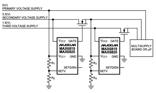 另一個達成相同結果的簡單方法是採用電壓偵測器,電壓偵測器可比監控元件提供更多的資訊,因其能夠指出哪個電源電壓發生問題,監控元件通常會把所有的電壓以OR方式連接來產生單一重置輸出,而多重電壓偵測器通常提供可獨立檢視,以決定問題來源的開汲極輸出。現今市場已出現能夠提供獨立開汲極輸出的四電壓監測元件,這類元件包含可由電阻以及由工廠設定的臨界值,以符合1.8伏特、2.5伏特、3.3伏特、5伏特或-5.0伏特的常見電源電壓需求,內建精確的參考電壓及分壓電路更使得這類產品的設計變得相當精簡。