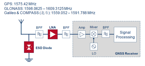 值得注意的是,支援多模GNSS的高整合度單晶片已陸續被發表;另外,也有低雜訊放大器可同時支援個別或同步接收GPS、GLONASS、COMPASS及伽利略(GALILEO)訊號,其頻率涵蓋範圍從1,550~1,615MHz,並且提供高線性度、低電流、低運作電壓、低功耗和具有開啟/關閉功能,其低雜訊指數可以提供好的靈敏度。雖然目前美國GPS為主要的導航定位技術,但在美國以外的地區,GPS的訊號如果有更多其他不同的衛星定位技術輔助,衛星能見度可以提高,亦可填補單一衛星接收不足或訊號品質不良的缺失,因此能使個人導航、資產追蹤、汽車導航等各類導航設備具備較佳效能提高定位精度外,在定位的速度也可大大提升,因此多衛星定位系統可望被大量應用。