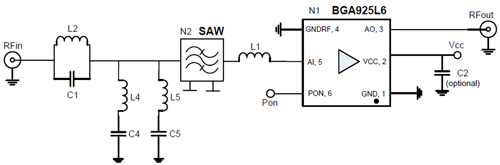 圖3 LNA應用電路圖,其中,濾波器可衰減頻帶外干擾。
