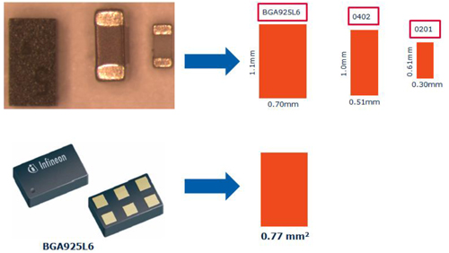 導航衛星模組的小尺寸與低功耗也是目前市場的需求,然而隨著兼具小尺寸、低功耗、高靈敏度與高整合度的單晶片問世,這些問題已大幅獲得改善,再加上室內定位與抑制多徑干擾能力大幅提升,促使導航衛星系統功能成為智慧型手機的一項標準功能。但高整合度單晶片仍需溫度補償晶體振盪器(TCXO)、表面聲波濾波器和LNA等外掛元件,尺寸上仍然偏大且要占用更大的電路板面積。因此選擇小尺寸的TCXO、表面聲波濾波器和LNA也有助於縮小導航衛星模組的尺寸。目前業界最小尺寸的LNA封裝尺寸接近0402尺寸大小,且封裝尺寸高度僅有0.40毫米(mm)(圖6),適合用於小尺寸的導航衛星模組內。圖3所示,在輸入端僅需要兩顆被動元件,電容器被用來當作直流電區塊(DC Block),而電感器提供輸入匹配。在GNSS應用下,通常會在LNA前端置放SAW濾波器以便衰減頻帶外的干擾,因此此時的輸入端電容器可以不須要使用。大多數的設計會在電路板上置放電源端的濾波電路,降低電源雜訊的干擾,因此導航衛星模組內就不需要在LNA電源腳位上置放射頻(RF)旁路(Bypass)電容器,僅須在輸入端置放一顆電感器。所以減少周邊被動元件的使用數量可以減少導航衛星模組內印刷電路板(PCB)的使用面積,並可以縮小導航衛星模組的尺寸。