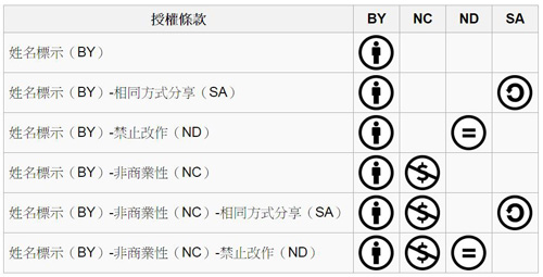 | 圖3 CC的六種創作分享、授權方式,Arduino採第二項的BY、SA。 圖片來源:維基百科