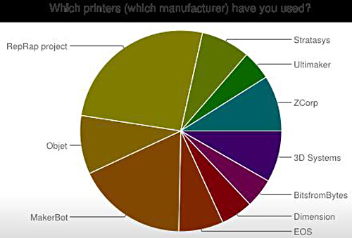 | 圖6 2012年曾進行調查:您曾用過哪款3D列印機?結果以RepRap專案的機種最多。 圖片來源:reprap.org |