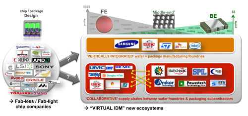 由於整合元件製造廠(IDM)可在廠房中研發並控制整個TSV流程,所以在起初擁有優勢,但建造28奈米(nm)以下的先進製程設備需要高度成本,越來越複雜的全新中段與後段技術和組裝與測試技術,也讓開發成本增加,因此極少公司擁有足以讓投資回本的大型生產規模。