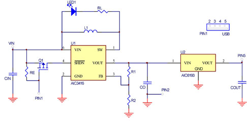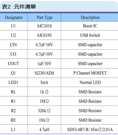 如圖1所示,應急充電路包含兩顆IC,一顆為AIC3416,主要功能在於提升電壓,以對手機內部電池提供一個標準的充電電壓;另一顆則為AIC6193,主要提供USB連接頭一個完整的電源保護與隔離。當USB連接頭插入手機連接器中,Pin 1被拉到電源Low的位準,作為開關使用的Q1 MOS與RE電阻,會告訴AIC3416開始將電池電壓升壓成系統所需的電壓。同理當USB連接頭拔出手機連接器,Q1 MOS及RE電阻的開關停止導通,AIC3416內部Shdn Pin會自動拉回電源Low的位準,停止供應輸出電源。電路在此採用一顆輸入電壓3.0~4.2伏特的鋰電池系統,以及兩顆輸入電壓1.8~3.0伏特的鎳氫與鎳鎘電池系統,輸出電源採用USB連接頭最常使用的電源5.0伏特,其輸出電壓的調整請參考公式1。