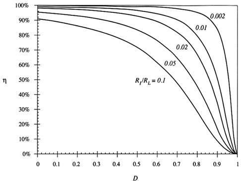 由這個特性曲線可知,若以輸入電源3伏特轉換至輸出電源5伏特,開關的工作週期D=(VOUT-VIN)/VOUT=0.4,此時如將電感的DCR值由0.1歐姆(Ω)降為0.05Ω,且負載電阻固定下,整體效率會由80%上升至90%。