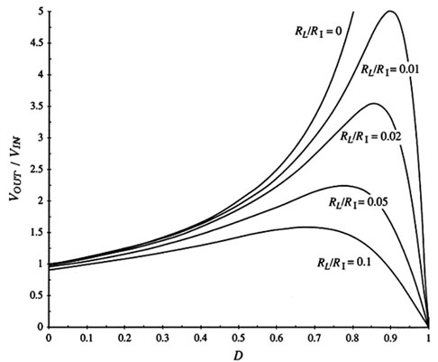 公式中RI、RL同樣分別為電感的DCR值與負載電阻值,D’同樣也可寫為1-D。當然公式5也是將二極體順向導通電壓VD,MOS導通電阻RDS(ON),二極體上導通電阻RD及其他輸出入電容的寄生電感電阻忽略,所求得的精簡公式。再一次將此精簡公式放入MATLAB軟體模擬,可得到輸出入電壓對工作週期的關係曲線(圖3)。