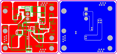 在製作這個印刷電路板(PCB)電路設計技巧上,要將大電流(High Di/Dt)迴路的元件先擺上,以利大電流迴路做最短距離的布線,同時布線要寬,以提升類比式升壓穩壓電路的效率。
