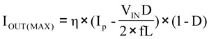 公式中的η即為評估效率,詳細的計算方式之後會再說明,在此採用實際量測的效率約90%;IP即為IC內部鋒值電流限制值(Peak Current Limit),其中AIC34XX系列產品有AIC3413、AIC3415與AIC3416升壓IC三種可供選擇,其內部鋒值電流限制值分別為900毫安培、1,300毫安培及1,600毫安培;VIN即為輸入電壓,在此能使用單一顆鋰電池系統或採用兩顆鎳氫、鎳鎘電池系統,其電壓分別為3.0~4.2伏特與1.8~3.0伏特;D為開關的工作週期(Duty Cycle),其值可利用(VOUT-VIN)/VOUT求得;而f為切換穩壓器的工作頻率,在此AIC34XX系列產品全部採用1.2MHz工作;最後L為應用電路上的電感值,在此採用IC Datasheet應用電路上的4.7微亨(μH)的電感。