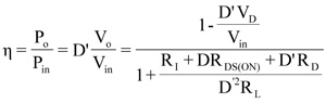公式4是將二極體順向導通電壓VD,MOS導通電阻RDS(ON),二極體上導通電阻RD與其他輸出入電容的寄生電感電阻忽略,所求的精簡公式,比實際效率分析要來得簡單,也毋須考慮到多個元件的寄生效應。