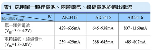 利用上式及其條件,可求得以下列表,其中分別採用單一顆鋰電池、兩顆鎳氫、鎳鎘電池對AIC34XX系列產品計算,求得的輸出電流情形。