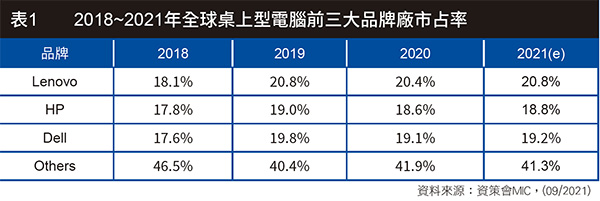 2020年,因為COVID-19疫情的影響,導致以商用市場為主的桌上型出貨量呈現嚴重衰退,進而讓前三大品牌廠出貨表現紛紛下滑。由於2021下半年疫情趨緩,商用市場的需求可望回溫,使得以商用市場為重的聯想與Dell將受惠於商用桌上型電腦需求的攀升而提高市場占比,HP雖然在商用市場的銷售表現不若Lenovo與Dell,不過在疫情期間靠著AIO PC的宅經濟需求,也為其增添不少的成長動能。