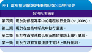 為進行浮動量測,適當的電壓探棒非常重要,選擇探棒和示波器組合,第一必須確定量測(或過壓)類別。IEC61010-1國際標準為電壓量測儀器規定四種過壓類別,一到四類(表1)過壓皆依據暫態訊號期間,可能存在的電氣能量多少來確定。電壓量測儀器根據耐受電壓暫態訊號的能力來劃分等級。第二,確定最大浮動電壓。第三,確定探棒頭到接地最大電壓。第四,確定從探棒頭到參考引線的最大電壓。最後,確定螢幕上希望的最大峰對峰值讀數。