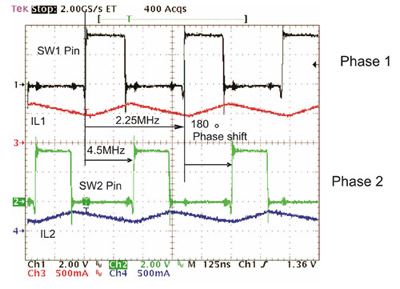 圖3為轉換節點SW1、SW2,以及對應電感電流的量測圖。在高位開關間的180度相移需要4.5MHz的有效轉換頻率,這是原本時脈頻率的兩倍。
