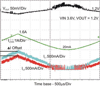 透過對電感電流IL1與IL2的量測,圖5說明了兩個轉換器間的電流平衡,其中輸出電流上升下降的範圍由20毫安培至1.6安培,而電感電流IL1與IL2則會同時增減,並出現些許誤差。