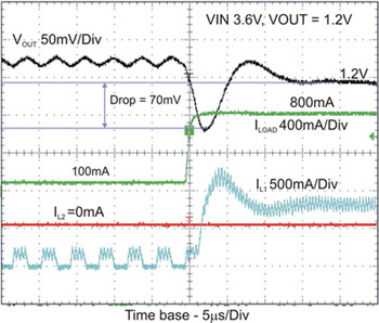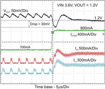 圖6為雙相配置中負載暫態響應的量測圖,圖7則是單相配置中的情形。兩種情況中使用相同的負載步驟,即由100毫安培至800毫安培,不過圖6中的DC-DC 2停用。在雙相配置中,VOUT的電壓降減少一半,絕對電壓降只有30毫伏特;相較之下,單相操作中則為70毫伏特。如果與單一轉換器操作比較,兩個轉換器的反應速度都加快,並能傳輸更多電流至輸出端。