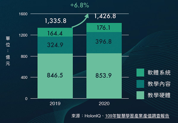 根據HolonIQ統計,2020年台灣整體智慧學習產業產值達新台幣1,426.8億元,較2019年成長6.8%,其中教學硬體、教學內容、軟體系統各占60%、27.7%及12.3%,相關商機頗值得期待。