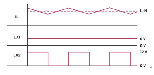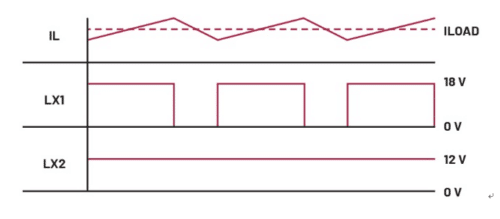 當降壓模式的內部比較器因輸出電壓顯著低於輸入電壓而觸發時,電路即作為純降壓轉換器運作。要在降壓區域工作,開關3必須保持導通,開關4必須保持關斷。隨後,開關1和開關2可如同一般強制脈寬調變(Forced Pulse Width Modulation, FPWM)降壓轉換器般切換節點LX1(Switch Node, 開關節點),如圖2所示。
