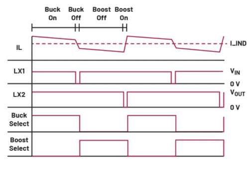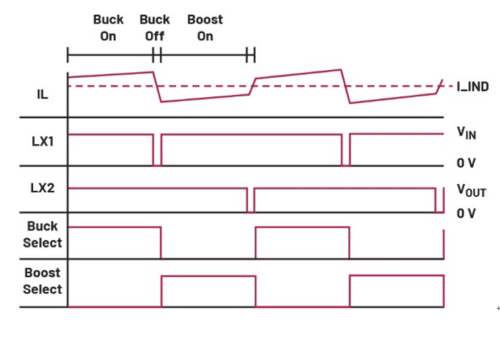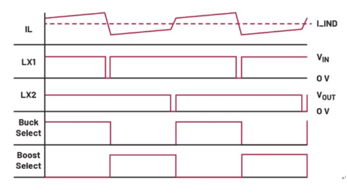 當輸出電壓接近輸入電壓(略高或略低)時,電路將在降壓-升壓區域工作。