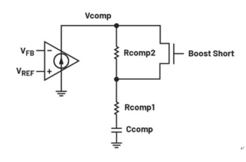 在對降壓- 升壓積體電路進行補償時,交越頻率的選擇必須考慮最壞情況下的負載、輸入電壓、輸出電容值和電感值。由於降壓-升壓積體電路可在升壓區域工作,最壞情況下的VIN可能使電路進入純升壓模式。當電路工作在純升壓模式時,會受到RHPZ的額外限制。由於RHPZ與電感充電和向輸出端傳輸能量之間的時間延遲相關,因此必須對迴路進行補償,使其頻率為該零點頻率的1/3至1/5。正因如此,即便在無RHPZ的降壓區域有更大頻寬可用, 降壓-升壓電路的瞬態響應仍會受到限制。通常,為了補償控制迴路,會使用由補償電阻Rcomp1和補償電容Ccomp 組成的阻容(Resistor-Capacitor, RC)補償網路,以提供合適的相位和增益。為了優化升壓和降壓區域的瞬態響應, 可在RC補償網路中額外增加一個電阻(Rcomp2),並在Rcomp2兩端並聯一個開關,使其根據電路工作區域來接入或關斷補償網路。當電路工作在升壓模式時,開關將Rcomp2短路,進而降低交越頻率;當電路進入降壓-升壓或降壓區域時,開關關斷,Rcomp2可進一步調整增益和相位補償,這將產生提高交越頻率的效果。此設計可使電路在升壓區域具備較低交越頻率,而降壓區域則維持較高交越頻率,如圖7。