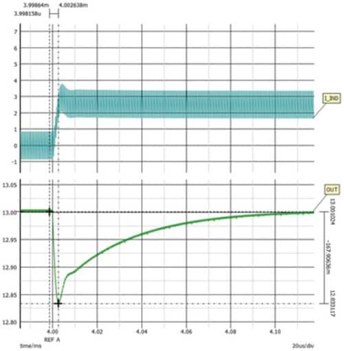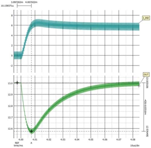 選定Rcomp和Ccomp後,就必須針對18VIN的降壓區域對電路進行補償。由於該區域不存在RHPZ,因此將交越頻率選為100kHz,隨後可調節Rcomp2來實現此一交越頻率。一切就緒後,需檢查每種情況下的瞬態響應。由於增加了Rcomp2,降壓區域和降壓-升壓區域中的瞬態響應得以改善, 如圖8至圖10所示。