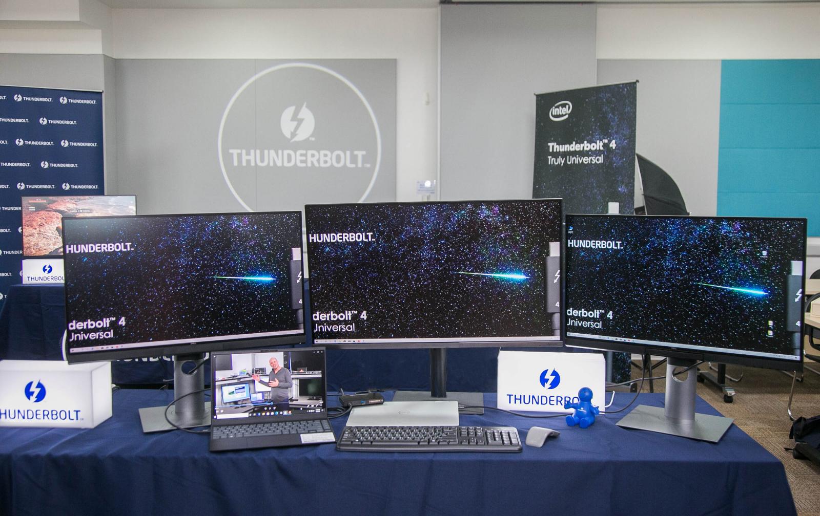 英特爾今年新推的Thunderbolt 4符合USB 4規格,傳輸速度雖與上一代相同,但是因應高解析度影像傳輸的需求日增,原先Thunderbolt 3只能連接一個4K螢幕,Thunderbolt 4則增加為支援兩個4K螢幕或一個8K螢幕的功能,PCIe速度達到32 Gb/s。Thunderbolt 4具有兩公尺的傳輸能力,因此通用傳輸線可達兩公尺,擴充底座最多可支援4個Thunderbolt 4連接埠。外部配件方面,Thunderbolt 4可支援至少一個PC連接埠充電、睡眠喚醒功能。而透過英特爾VT-d的記憶體存取(DMA)保護功能,有助於防止實體連接的資安攻擊。