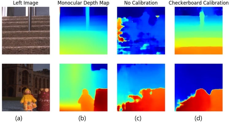 此外,由於單目測距系統缺乏視差(Parallex)資訊,因此只要改變物件的比例尺度,物件的深度就會產生很大的誤差。雙目測距系統可以使用視差資訊來修正,很容易就能避免這樣的錯誤發生。在圖1(b)的上方,單目相機所產生的階梯深度圖沒有比(d)的雙目相機所產生的深度圖層次分明。在圖1(b)的下方中,背景是大樓,深度應該是固定值,但單目相機所產生的背景深度圖顏色,卻沒有像(d)的雙目相機所產生的背景深度圖一樣全部都是藍色。所以,雖然雙目相機的校正程序有些麻煩和複雜,但使用雙目相機來測量深度,仍然是最精確的方法。圖1(d)是使用棋盤格校正過的雙目相機,(c)是使用未校正的相機產生的深度圖,其深度誤差很大。