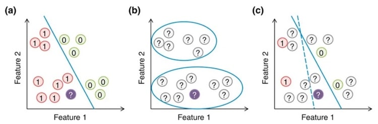 圖2(a)是監督式學習、(b)是無監督式學習、(c)是半監督式學習的簡易分類。監督式學習就是在訓練用的資料集合中,每一筆資料都有相對應的標註,如圖2(a)中,資料已被人為區分成標註0和標註1兩類。簡言之,監督式學習就是用標註資料來訓練模型,等此模型訓練完畢後,再用此模型對尚未標註的「?」資料進行預測,最後將它們標註。