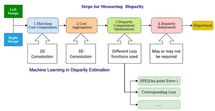 圖4是使用傳統的雙目相機估算視差圖的流程,圖中並對應至使用雙目相機和卷積神經網路(Convolutional Neural Network, CNN)來估算視差圖的監督式學習的流程。其中包含了四個主要步驟:匹配成本計算(Matching Cost Computation)、成本量聚合(Cost Volume Aggregation)、視差計算(Disparity Computation)、視差最佳化(Disparity Optimization)。