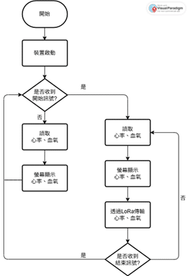 圖11所示為穿戴式裝置端之韌體流程圖,當穿戴式裝置啟動後,會開始收集心律與血氧數據,並將結果顯示在螢幕上。如果接收到藉由接收站轉傳的開始訊號,裝置則透過LoRa模組將測量數據傳送至接收站,且會持續傳輸,直到接收到停止訊號為止。在此期間,螢幕會不斷更新顯示最新的數據。