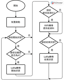 圖12為接收站端之韌體流程圖。當裝置啟動後,依序判斷接收到的資料類型,包括開始訊號、使用者資料或結束訊號。若WiFi傳輸模組接收到開始訊號,且判斷編號為A(圖18所示的游泳池角落的接收站編號),則透過LoRa傳輸模組發送開始訊號至穿戴式裝置。之後,LoRa傳輸模組接收來自穿戴式裝置的使用者資料。若有則透過WiFi傳回網站伺服器。最後,若收到結束訊號,則由LoRa傳輸模組發送結束訊號至穿戴式裝置,再開始下一輪的接收判斷。