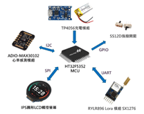 圖13為穿戴式裝置硬體架構圖,其包含穿戴式裝置之HT32F52352元件與周邊模組的連結關係圖。其中,穿戴式裝置側邊設有滑動開關用於喚醒螢幕,並透過GPIO加以控制。運用UART協定來連接LoRa模組,並接收訊號及發送使用者資料到接收站。使用者資料包含有心率、血氧、計時時間以及穿戴式裝置與接收站之間的訊號強度值。此外,透過I2C協定與心率感測器溝通,測得心率血氧值後,心率血氧值與目前的時間會透過SPI協定傳送到螢幕上顯示,鋰電池與充電模組則為穿戴式裝置提供電力來源。
