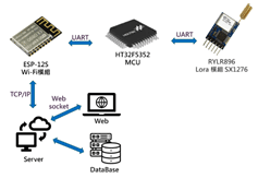 圖14為接收站硬體架構圖。其中包含接收站之HT32F52352核心元件與周邊模組連結關係圖。接收站裝置使用LoRa模組,作為接收使用者訊息的傳輸方法,並以UART協定,傳輸給開發板,接著透過UART協定送給ESP-12S WiFi模組,ESP-12S WiFi再以TCP/IP協定傳輸到伺服器,將經過處理的資訊顯示在網頁上。