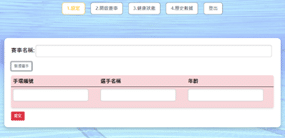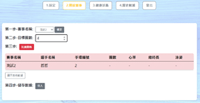 圖19為操作網頁畫面。此為設定頁面需在賽前登記運動員訊息。圖20所示為設定賽事頁面與顯示當前比賽圈數、心率及時間頁面。一開始,使用者可選擇場次與輸入圈數,按下「比賽開始」後,如再按下更新資料按鈕,會開始顯示當前的比賽圈數、心率及時間斗資訊。按下存入按鈕後,即可記錄本場賽事資料。