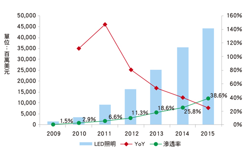 現階段在政府政策加持以及廠商致力提升品質與降低成本下,LED照明已逐漸為消費者所接受,特別是工商用市場因為開燈時間較長,大幅拉低其轉換LED燈具所需的回本時間,因此LED照明市場可望開始出現顯著成長。根據Digitimes統計,2012年全球LED照明市場規模約165億2,000萬美元,年成長率(YoY)80%,預估至2015年,整體市場規模可達442億美元(圖3)。