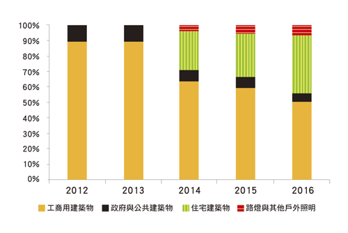 與LED照明發展初期相同,智慧照明系統因為初期建置成本較昂貴,因此建置所能帶來成本下滑幅度多寡,變成消費者是否採納的關鍵。由於辦公大樓、百貨公司、複合式商場以及量販店等,照明設備占耗電比重均達25~30%,因此工商用市場成為智慧照明系統主要需求者。就2012年來看,工商用市場占比即接近90%,其次則是政策導向的政府與公共建築,占比約在10%左右,預計住宅部分要等到2014年,相關產品價格大幅滑落後,占比才會有顯著增長(圖4)。