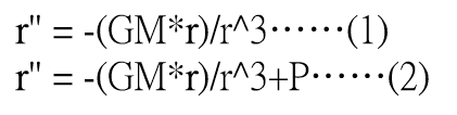 這些擾動加速度的大小是一些參數的函數,其中最重要的參數是衛星的高度(Altitude)。公式(2)是它的數學式,P是施加在衛星上的擾動加速度之向量總合。
