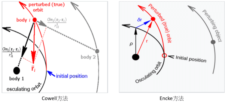 藉助現今電腦的計算能力,數值法較常被使用。數值法需要一個定軌方法和一個數值演算法,前者是指包含了擾動加速度的衛星運動方程式,例如:Cowell方法、Encke方法,如圖1。然後,衛星在特定時間點的狀態向量可以用選定的數值演算法得出。可選擇的數值演算法包含歐拉方法(Euler Method)、多步法(Multi-step Method)、Runge-Kutta方法、配置法(Collocation Method)。一旦求出X(ti)的解,就可將X(ti)代入公式(4),得到公式(6)。