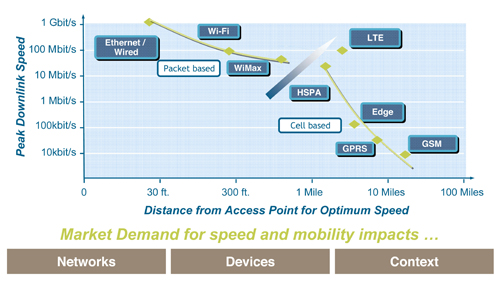 根據飛思卡爾提供的長程演進計畫(LTE)與3G的演進圖(圖4)顯示,至2010年,2G產品的出貨量開始下滑,3G的採用加快成長腳步,至於3G以上與LTE則展開初期的部署,其中,中國大陸被視為最大的增長市場。針對業界爭論不休的全球微波存取互通介面(WiMAX)與LTE之爭,Su認為,就行動網路向下延伸及蜂巢網路向上延伸的發展脈絡(圖5)而言,兩種技術的規格包括傳輸速度、頻寬等皆已相當接近,未來可望融合。