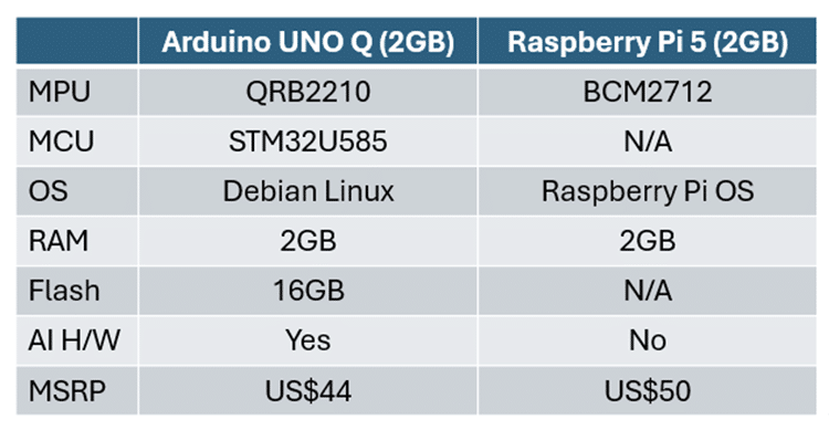 圖3 Arduino UNO Q與Raspberry Pi 5簡易比較表(圖片來源:陸向陽)