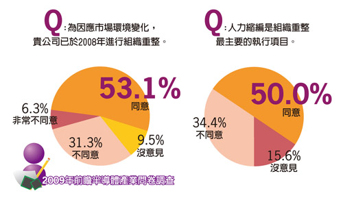 在因應市場需求疲弱方面,調查結果發現,隨著景氣持續下探,43%的半導體業者認為縮減資本支出是因應市場需求下滑的首要策略;而控制成本更是在不景氣中維持獲利的重要手段(圖1)。此外,有半數以上業者表示,該公司已於2008年進行組織重整,其中,又以人力縮編為主要執行項目。而37.5%的業者也同意,人力縮編是節省營運成本最快速、有效的作法(圖2)。