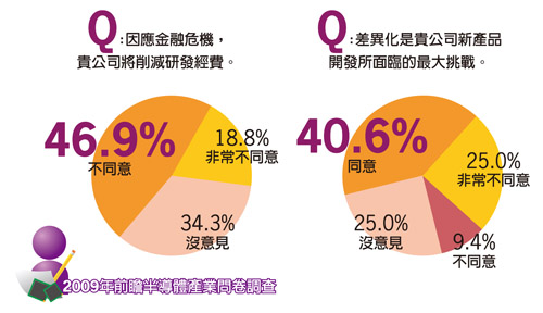 受金融風暴影響,市場信心潰散,首當其衝即是消費市場需求急速降溫,包括消費性電子與汽車市場銷售量也明顯減弱。不過,儘管如此,大多數半導體業者並未因此見風轉舵,反倒更專注於核心產品的研發,並設法藉由差異化脫穎而出。在此次問卷調查結果中也顯示,40.6%的業者,在2009年不會將產品發展重心轉移至非消費性領域,但也有21.9%的業者計畫改變發展方向。此外,有40.6%的業者認為,差異化是新產品開發所面臨的最大挑戰,而將近七成的比例表示,2009年將不會縮減研發經費(圖8)。