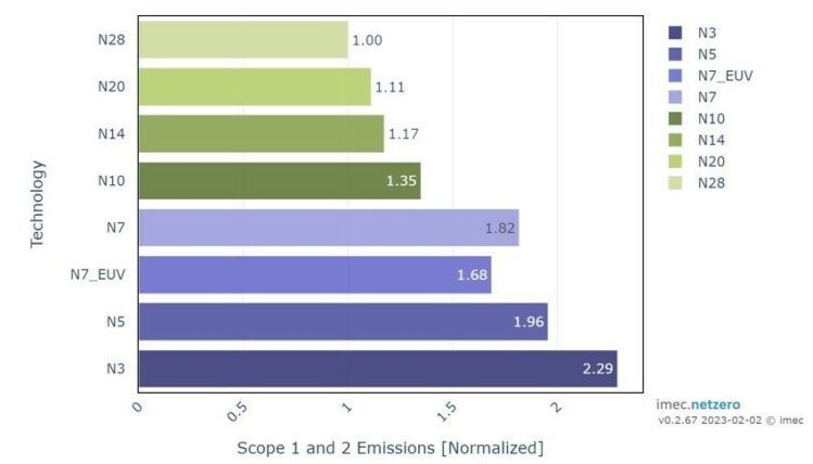 imec.netzero模擬平台是這項計畫的產物,imec與其夥伴合作,利用該平台,首次成功量化不同邏輯晶片世代的圖形化製程所帶來的環境影響。imec技術研究主任Emily Gallagher解釋:「透過應用『虛擬晶圓廠』這項工具,我們展示了生產3奈米邏輯晶圓的微影與蝕刻製程,在範疇1(自有或自行操作資產的直接碳排)與範疇2(外購電力的間接碳排)的碳排占比共達45%。另外,該模擬工具還能在晶圓廠實際操作實驗時量化收益。舉例來說,減少10%的EUV曝光劑量,相當於每片晶圓減少0.4kg的二氧化碳排放量。這能為大型晶圓廠省下每月40噸的二氧化碳排放量,等同於美國舊金山與波特蘭來回飛行100趟的碳排量。