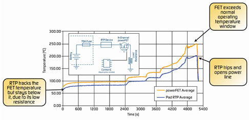 | 圖2 在一次慢性熱失控情況下,RTP元件會跟蹤功率場效電晶體溫度,直到它在200℃時斷開電路。 |