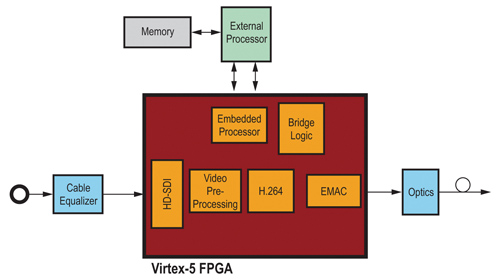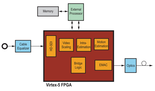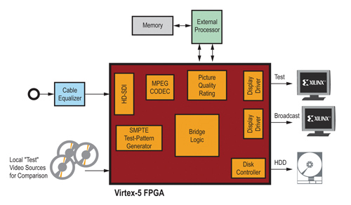現今最新的高階FPGA元件,大多已擁有為數可觀的邏輯資源,並能提供媲美特定應用積體電路(ASIC)的效能。其中,有些FPGA元件更結合了所有廣播設備研發業者需要的功能,包括嵌入低功耗的3.2Gbit/s收發器,能支援SDI、HD-SDI、雙鏈路HD-SDI、3G-SDI、DVB-ASI、AES數位音樂、乙太網路以及PCI Express等各種標準;高速數位訊號處理(DSP)模塊;嵌入式處理器;乙太網路媒體存取控制;PCI Express核心;甚至影像IP核心等。