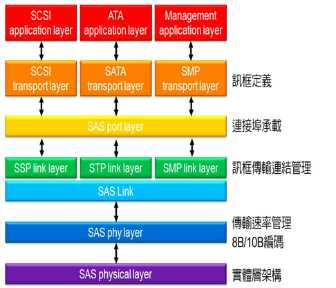 SAS的傳輸協定可分為三種(圖1),首先是用於傳輸SCSI命令的序列SCSI協定(SSP);其次為用於傳輸SATA資料的SATA通道協定(STP);最後則是用於對SAS裝置的維護和管理的SCSI管理協定(SMP)。在SAS的拓撲中由發起器(Initiator)、目標裝置、交換器(Expander)共同組成,其中發起器通常是伺服器或HBA卡,目標裝置可能是硬碟,交換器則是SAS交換機。